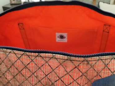 Tote bags are built for durability with webbing straps that encircle the bottom of the bag. This mixed material bag was customized with Dacron and carbon fiber sailcloth and lined with anchor fabric.
