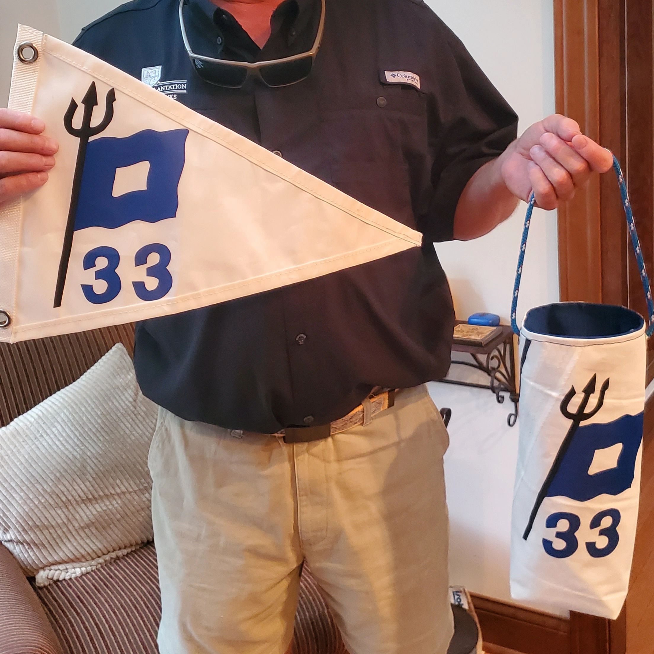 We can customize any combination of products to create gift sets they will treasure! This burgee and bag featured a vessel logo.