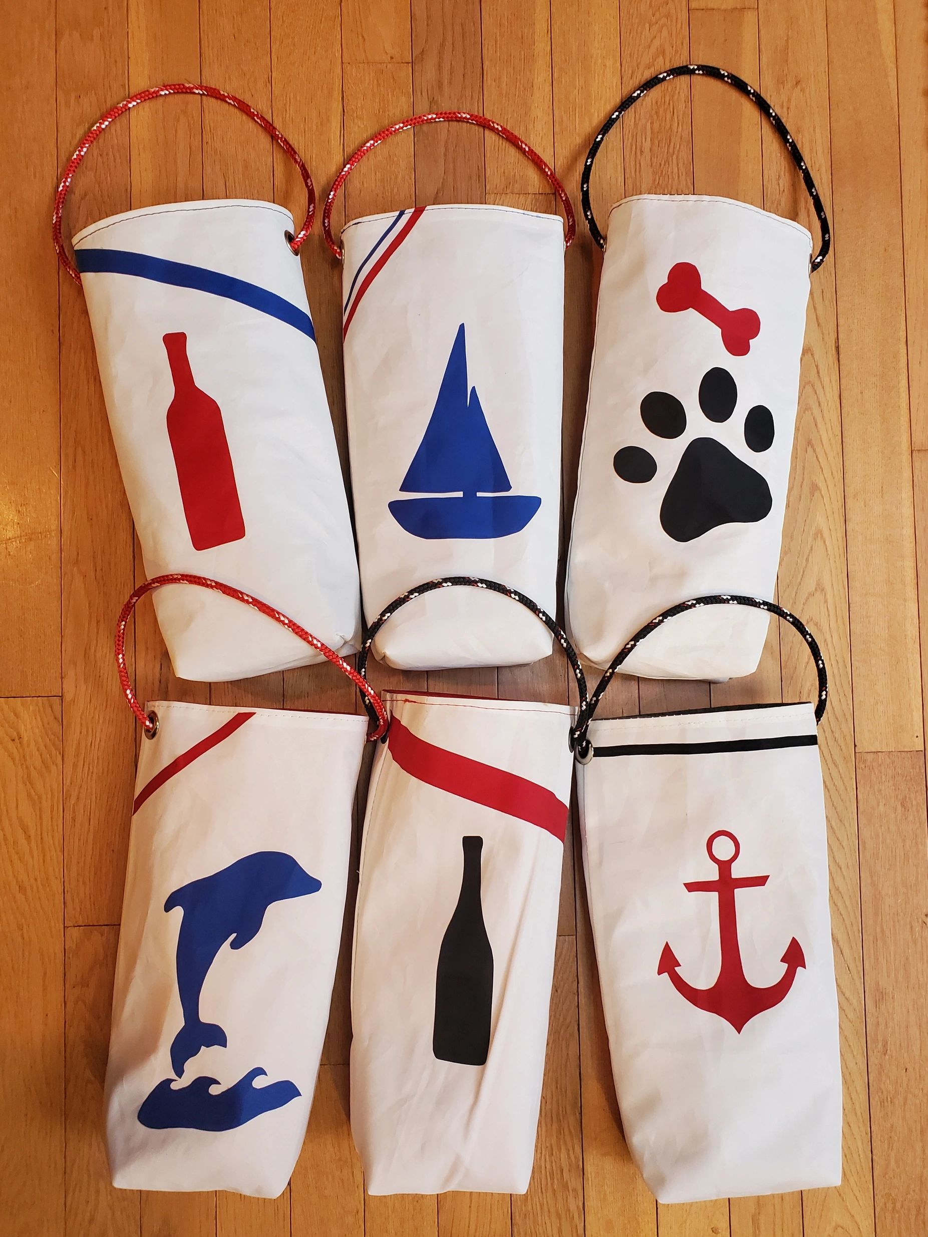 Strong and durable, these bags are made from retired sails and lined with marine canvas. Sized large enough to hold up to a 2 liter bottle, yet cozy enough for a bottle of wine.